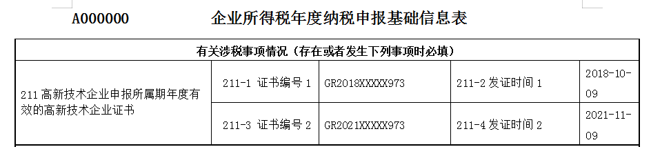 例如:甲企業(yè)2018年10月取得高新技術(shù)企業(yè)證書(shū),有效期3年,2021年再次參加認(rèn)定并于2021年11月取得新高新技術(shù)企業(yè)證書(shū),納稅人在進(jìn)行2021年度企業(yè)所得稅匯算清繳納稅申報(bào)時(shí),應(yīng)將兩個(gè)證書(shū)的“編號(hào)”及“發(fā)證時(shí)間”分別填入“211-1”“211-2”“211-3”“211-4”項(xiàng)目中。