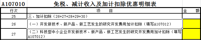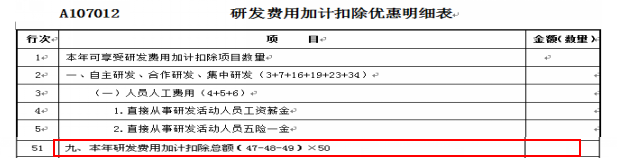如企業(yè)發(fā)生的研發(fā)費(fèi)用符合研發(fā)費(fèi)用加計(jì)扣除政策規(guī)定,可以同時(shí)享受研發(fā)費(fèi)用稅前加計(jì)扣除優(yōu)惠。通過(guò)《A107012研發(fā)費(fèi)用加計(jì)扣除優(yōu)惠明細(xì)表》填列,其51行填列至《A107010免稅、減計(jì)收入及加計(jì)扣除優(yōu)惠明細(xì)表》的第26行或第27行。