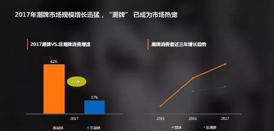 在政策方面,政府出臺(tái)了很多措施通過降低電子商務(wù)企業(yè)的創(chuàng)業(yè)成本和運(yùn)營成本,來鼓勵(lì)電子商務(wù)的發(fā)展。在經(jīng)濟(jì)方面,消費(fèi)者的消費(fèi)觀已經(jīng)由物質(zhì)層面轉(zhuǎn)向?yàn)榫駥用妫瑥漠?dāng)初的“穿的暖"變?yōu)楝F(xiàn)在的“穿的好",年輕的新興消費(fèi)者也更為注重品牌的價(jià)值,更為青睞產(chǎn)品本身的文化。潮流市場文化的追捧熱度持續(xù)增長,根據(jù)尼爾森全球潮牌大數(shù)據(jù)報(bào)告可知,中國 2017年潮牌的消費(fèi)增速達(dá)到 62%,是非潮牌的3.7倍。