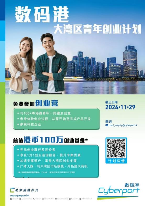與此同時,「數(shù)碼港大灣區(qū)青年創(chuàng)業(yè)計劃」2024現(xiàn)已接受申請,計劃提供總值港幣100萬種子基金及免費參加創(chuàng)業(yè)營的機會,助你廣闊視野,認識超過170名粵港澳青年一同學習、激發(fā)創(chuàng)意、建立新項目或加速你項目的成長,有機會開拓粵港澳市場。此計劃由數(shù)碼港創(chuàng)意微型基金支持,在6個月計劃期內(nèi),支持具潛質(zhì)的數(shù)碼科技創(chuàng)新概念及具備產(chǎn)品雛型的早期初創(chuàng)企業(yè)的發(fā)展,印證市場需要及邁向加快發(fā)展階段,截止申請日期為2024年11月29日。