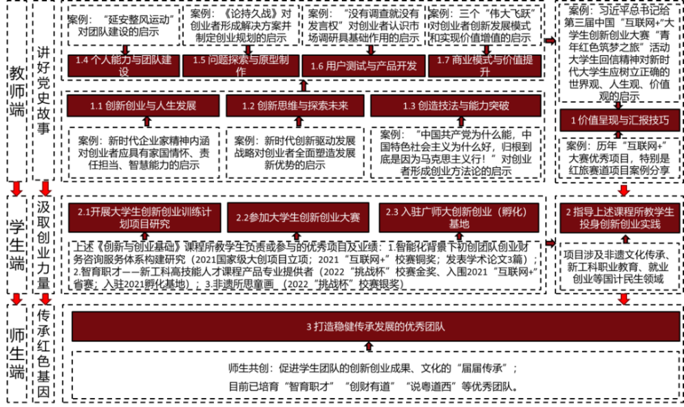 我校創(chuàng)新創(chuàng)業(yè)學(xué)院成立于2016年,負(fù)責(zé)統(tǒng)籌和落實(shí)全校創(chuàng)新創(chuàng)業(yè)教育各項(xiàng)工作。我校創(chuàng)新創(chuàng)業(yè)教育可分為理論教育和實(shí)踐教育兩個(gè)板塊,其中公共必修課《創(chuàng)新與創(chuàng)業(yè)基礎(chǔ)》是理論教育的主要渠道,實(shí)踐教育平臺(tái)主要包括大學(xué)生創(chuàng)新創(chuàng)業(yè)訓(xùn)練計(jì)劃項(xiàng)目、大學(xué)生創(chuàng)新創(chuàng)業(yè)大賽、廣師大創(chuàng)新創(chuàng)業(yè)(孵化)基地三個(gè)部分。研發(fā)該案例前的教學(xué)研究和實(shí)踐發(fā)現(xiàn),理論教育和實(shí)踐教育密不可分,這在創(chuàng)新創(chuàng)業(yè)專(zhuān)任教師經(jīng)常兼任《創(chuàng)新與創(chuàng)業(yè)基礎(chǔ)》課任教師、以上三大實(shí)踐教育平臺(tái)中的項(xiàng)目指導(dǎo)教師得以體現(xiàn);同時(shí),從創(chuàng)新創(chuàng)業(yè)理論教育到實(shí)踐教育常具有階段側(cè)重性特征;創(chuàng)新創(chuàng)業(yè)類(lèi)理論課程的課程思政建設(shè)是當(dāng)前研究熱點(diǎn),但整體面向理論和實(shí)踐教育開(kāi)展的課程思政研究卻鮮有報(bào)道。本案例以黨史學(xué)習(xí)教育為契機(jī),按照基于教師端-學(xué)生端-師生端協(xié)同的“師生共創(chuàng)型” 課程思政建設(shè)理念和“講好黨史故事,汲取創(chuàng)業(yè)力量,傳承紅色基因”的總體思路,構(gòu)建了《創(chuàng)新與創(chuàng)業(yè)基礎(chǔ)》“師生共創(chuàng)型”課程思政建設(shè)方法模型,該模型包括了如圖1所示的包括教師端(講好黨史故事)、學(xué)生端(汲取創(chuàng)業(yè)力量)、師生端(傳承紅色基因)的總體框架。以下詳細(xì)匯報(bào)教學(xué)過(guò)程實(shí)施及成效。