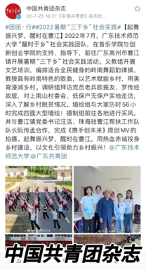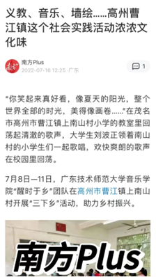 6.【社會實踐】2022-2023年連續(xù)兩年發(fā)起大學(xué)生暑期三下鄉(xiāng)社會實踐活動,獲得南方+、茂名日報、中國共青團等多方媒體報道,原創(chuàng)作品曾被曹江鎮(zhèn)當?shù)赝茝V適用,獲得廣泛好評等。