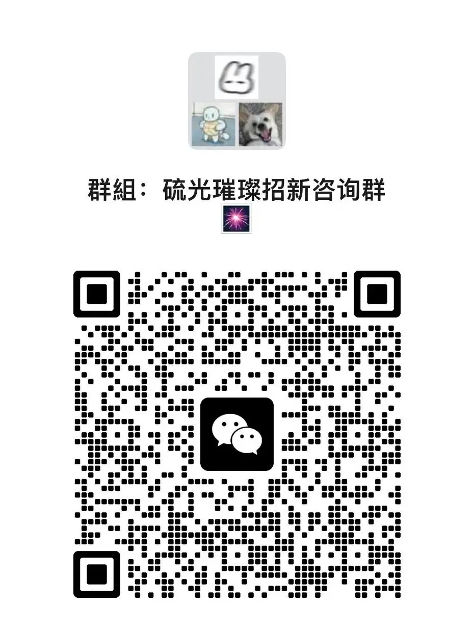2. 將文件打包壓縮并命名為:“硫光璀璨招新+意向組別+學(xué)院+名字”,發(fā)送到2305384318@qq.com;