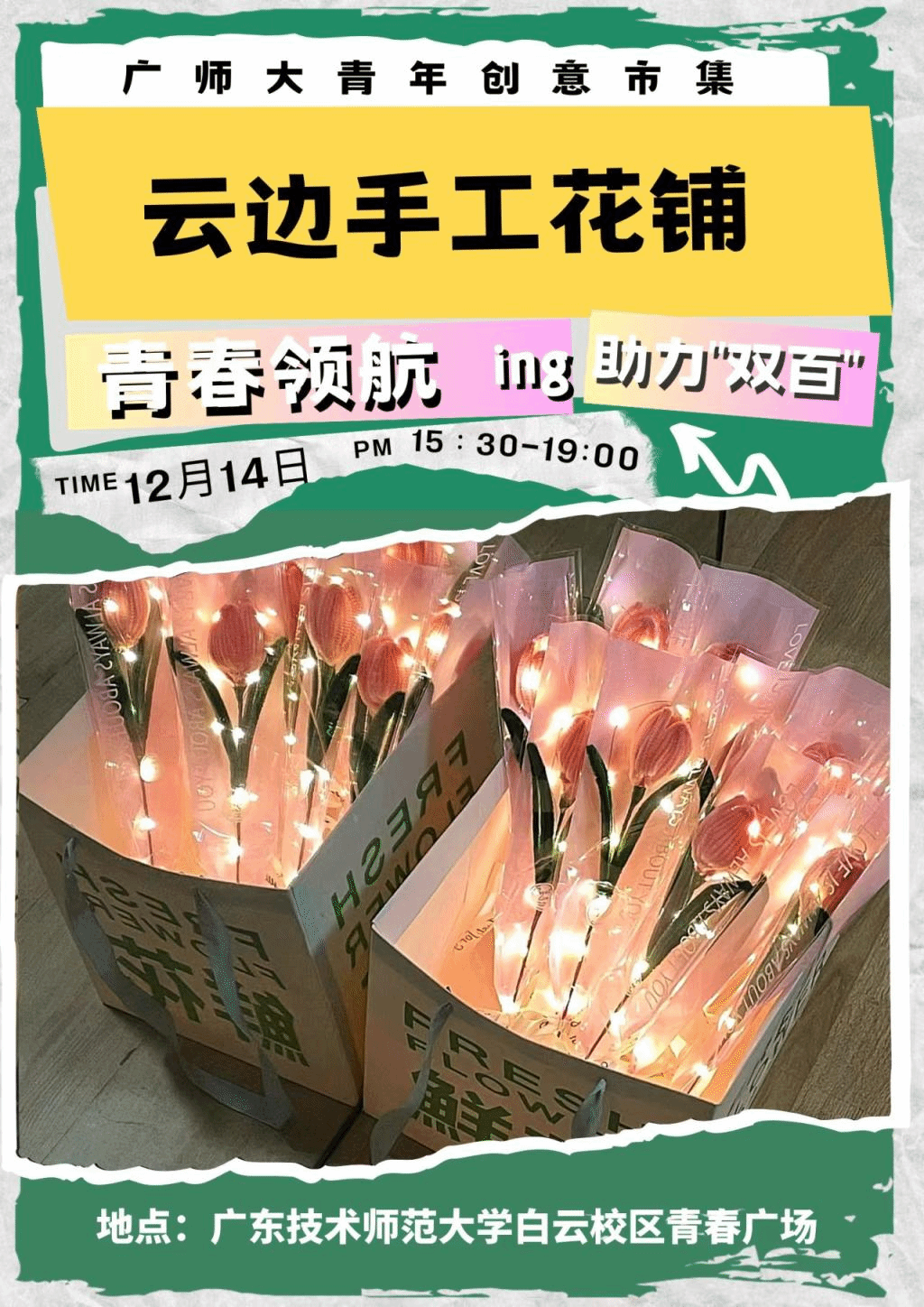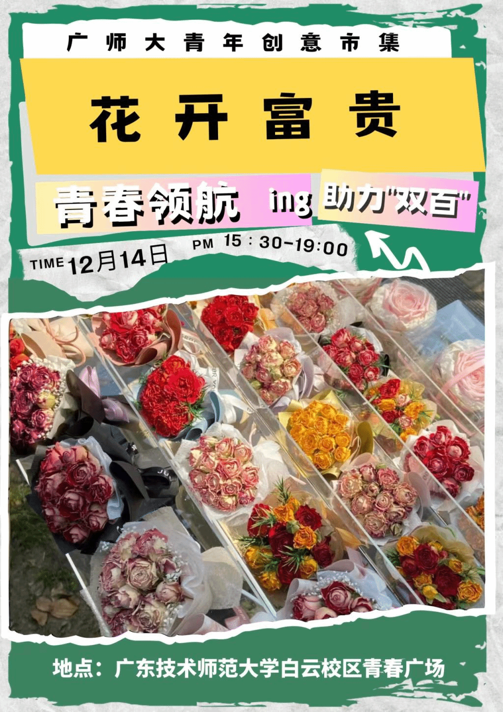 這是一個販賣花束和浪漫的小攤,也是大學(xué)生對于擺攤經(jīng)濟的嘗試與探索,而花開富貴代表我們由衷的愿望和誠摯的祝福。