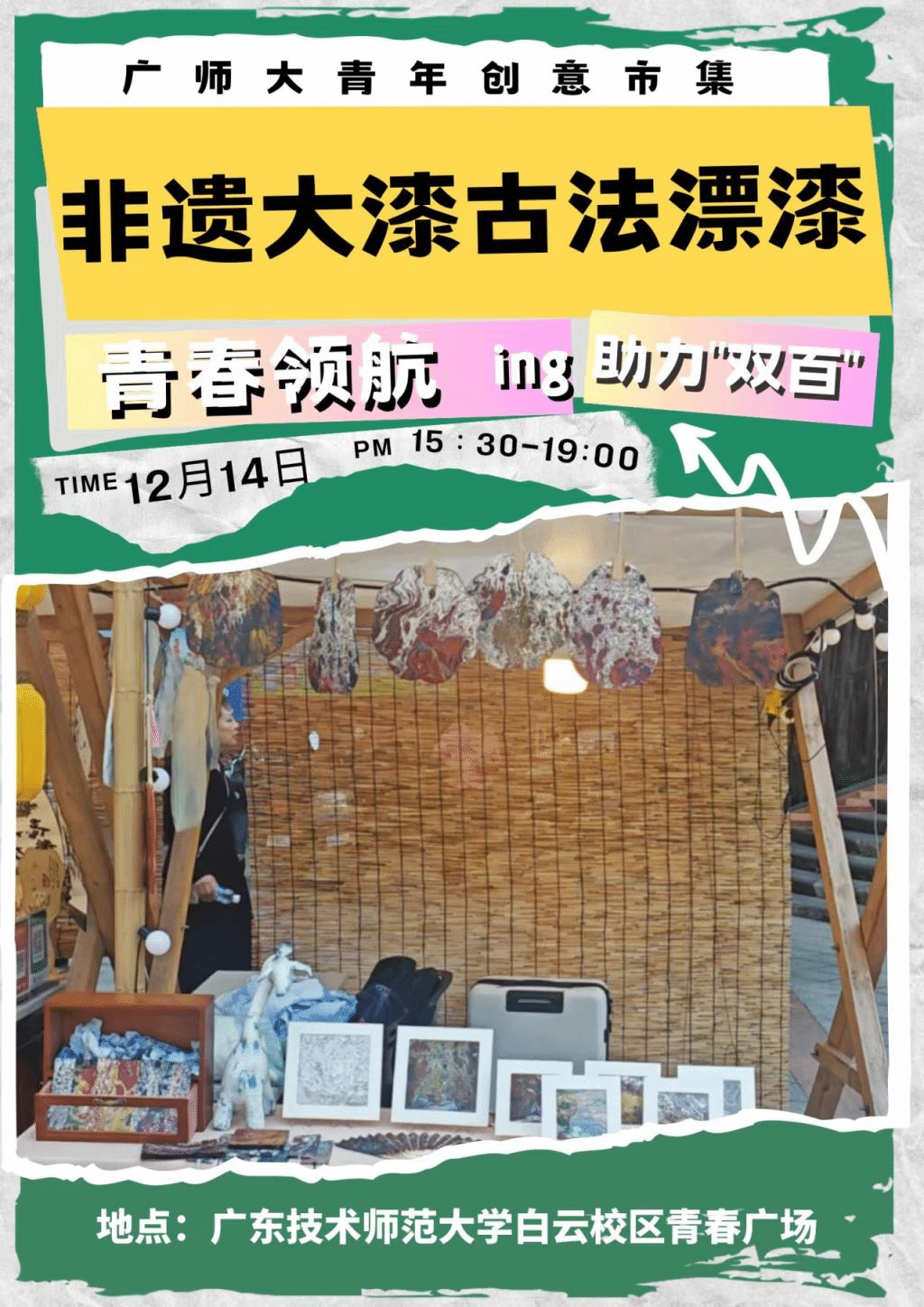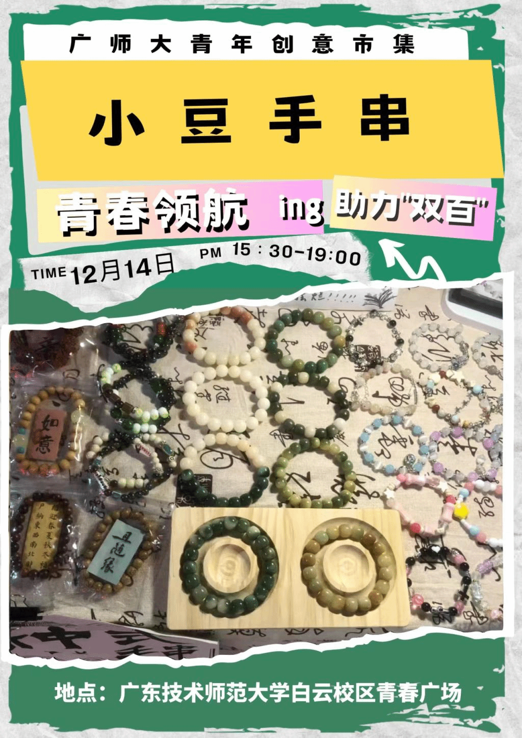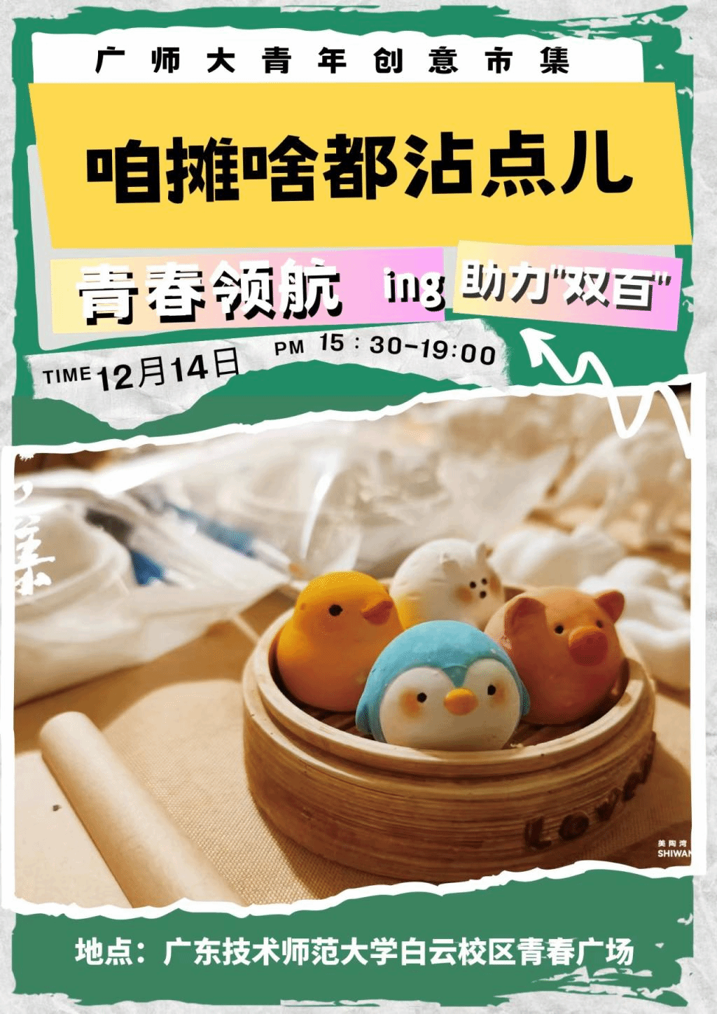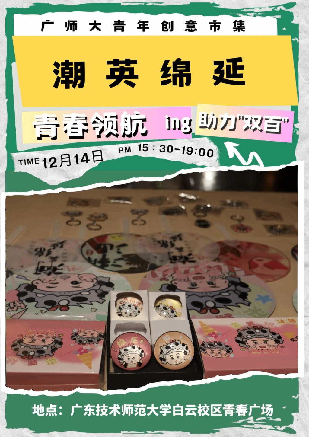 “創(chuàng)新引領(lǐng)、校村聯(lián)動”——本次青年創(chuàng)意市集邀請韶關(guān)樂昌市富農(nóng)公司和曾出席佛山南風(fēng)集的數(shù)十支優(yōu)秀青年創(chuàng)業(yè)團隊參加,產(chǎn)品涉及綠色新鮮農(nóng)產(chǎn)品、國潮潮玩、特色手工藝、原創(chuàng)設(shè)計、精致文創(chuàng)等特色產(chǎn)品。此外,新奇的布展風(fēng)格、原汁原味的現(xiàn)場制作、有趣的買賣互動都將給您帶來別具一格的市集體驗。