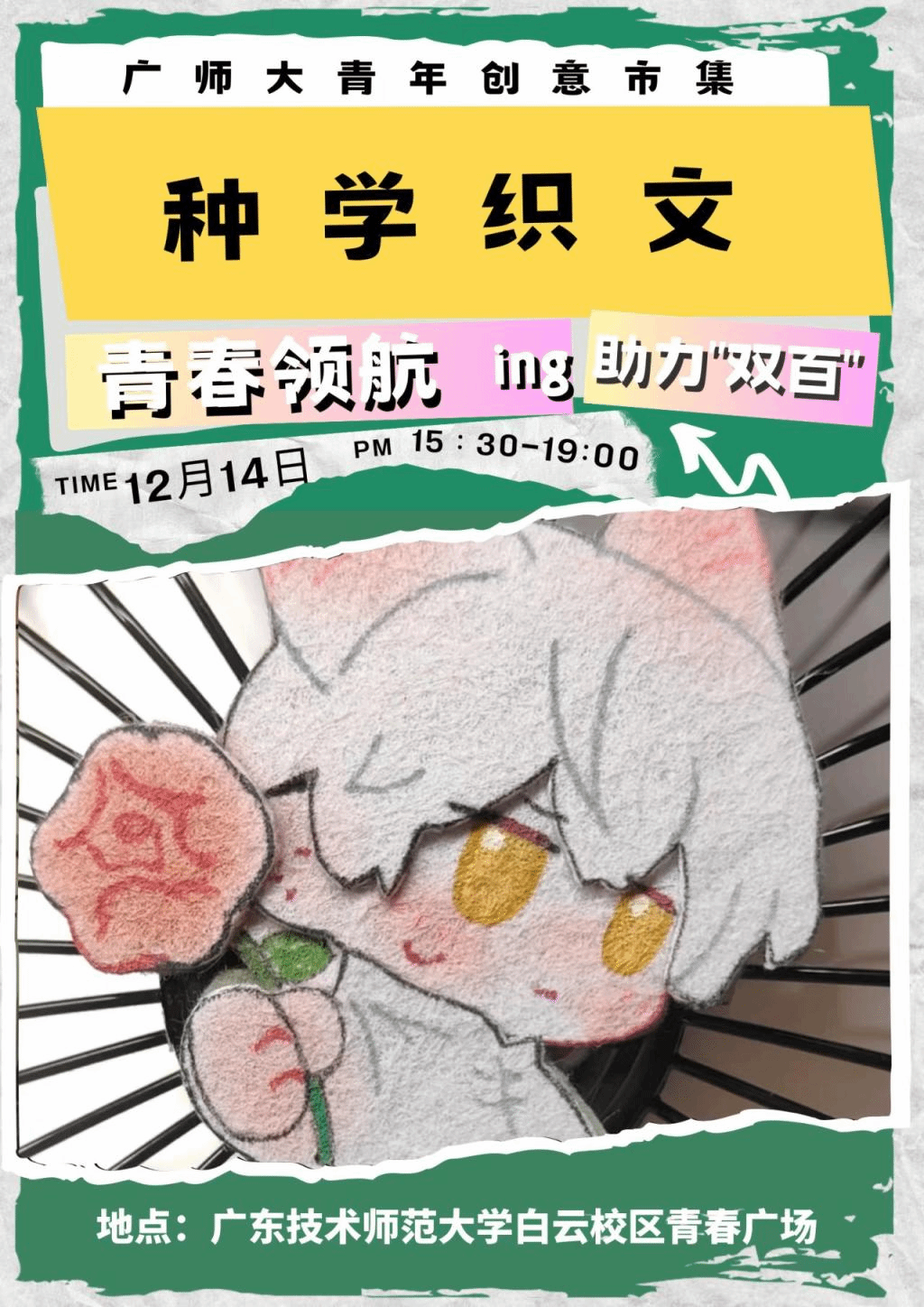 種學(xué)織文,出自明代宋濂,意思為培養(yǎng)學(xué)識,積累文才。我們選擇種學(xué)織文作為攤位名稱是因為不織布歷史悠久,色彩豐富的布料被用于制作各種服飾,配飾。不織布擁有很多優(yōu)點,尤其在環(huán)保方面。現(xiàn)在,不織布在醫(yī)療,工業(yè),農(nóng)業(yè)等地方都有很大用處。我們想讓大家在動手參與的過程中切身感受不織布的歷史。