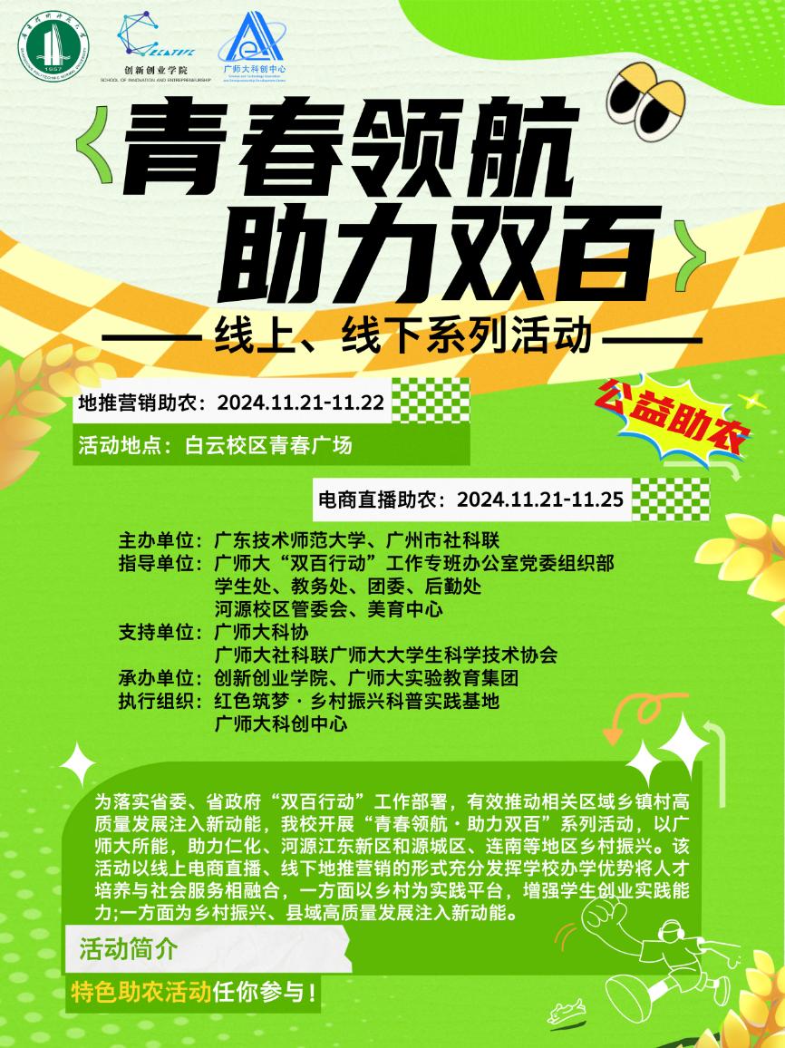 此次活動(dòng)以廣師大助農(nóng)直播團(tuán)隊(duì)為主力軍,將以廣師大所能,助力仁化、河源江東新區(qū)和源城區(qū)、連南等地區(qū)鄉(xiāng)村振興,發(fā)揮廣師大社科普基地、青年大學(xué)生科創(chuàng)成果等優(yōu)勢(shì);同時(shí),面向江高鎮(zhèn)中心中學(xué)學(xué)生,開展沉浸式的助農(nóng)科普實(shí)踐活動(dòng)。